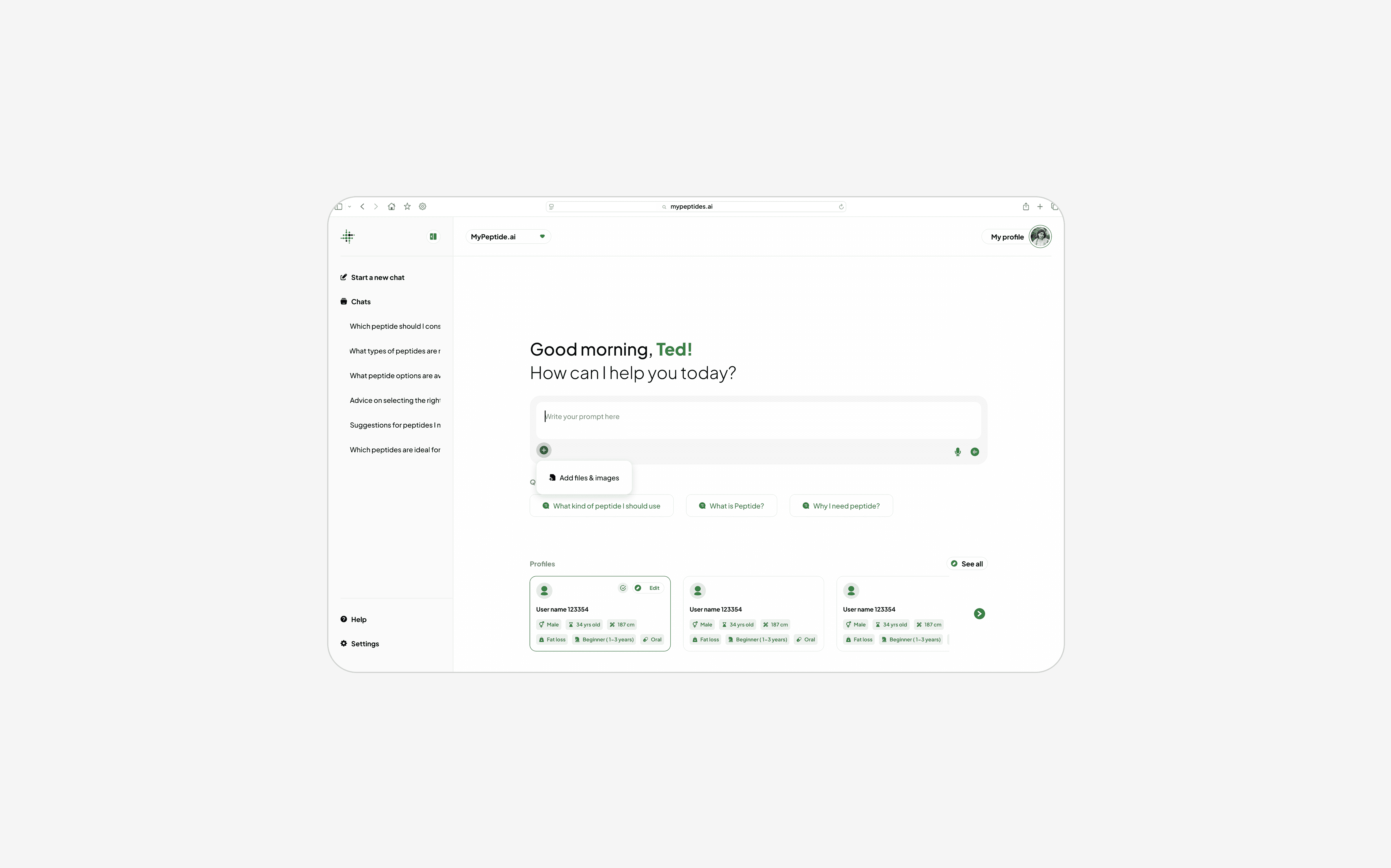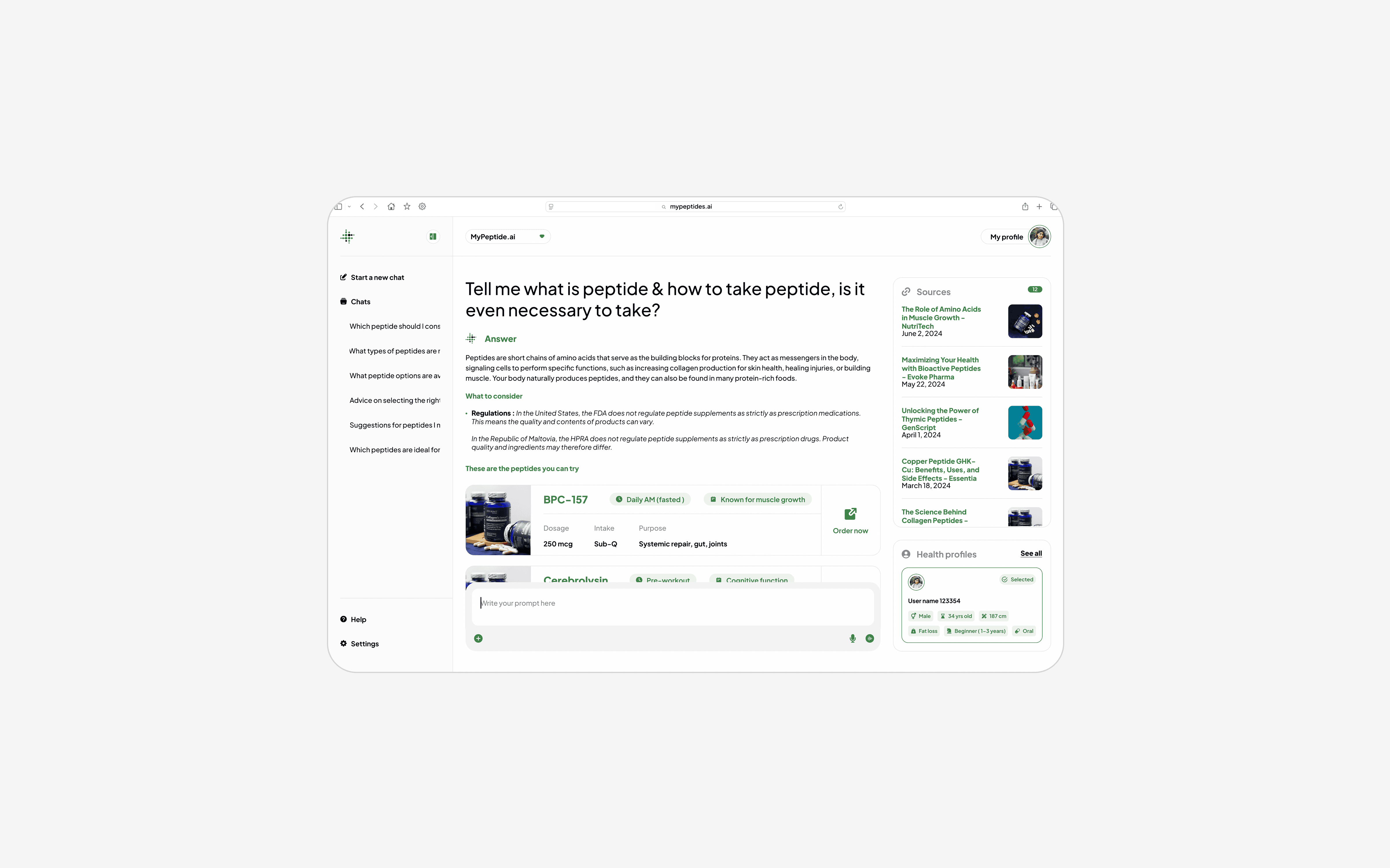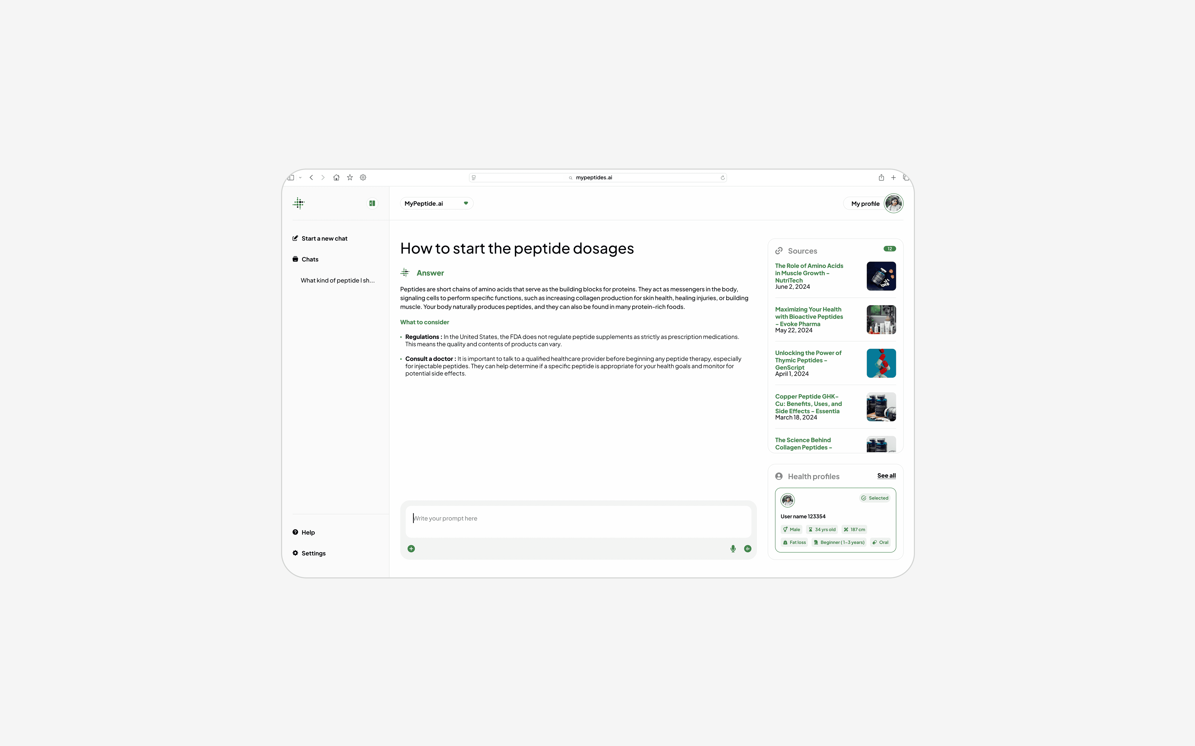 B2C side: AI-powered educational assistant for peptide knowledge and safety guidance. A responsive web app that is usable on any screen.